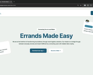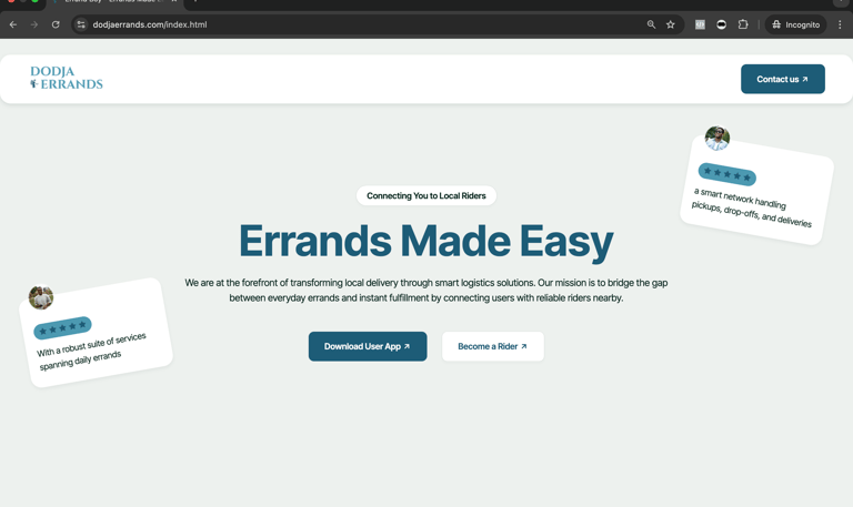 As the developer, I built both the Dodja Errands website and mobile app from scratch. The project includes two user roles — customers and riders. Customers can request errands, set pickup and drop-off locations, track progress, and make payments securely. Riders can accept tasks, view delivery details, and update statuses in real time.